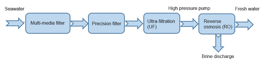 El elemento más crítico del proceso de desalinización por ósmosis inversa y ultrafiltración (UF-RO) es el uso de membranas semi-permeables que permiten la permeabilidad de la solución acuosa, dejando atrás la sal y otros sólidos disueltos para obtener agua dulce.