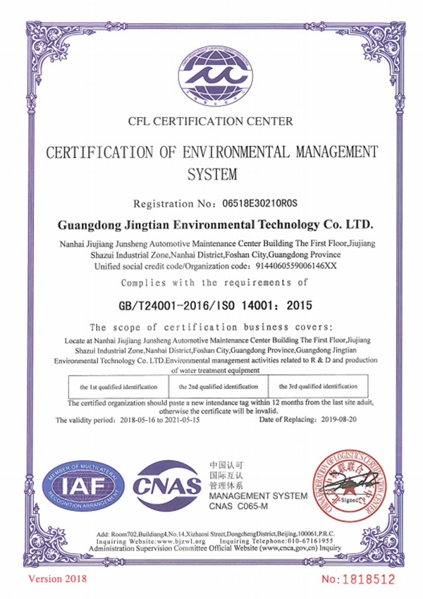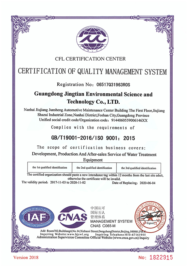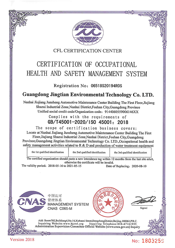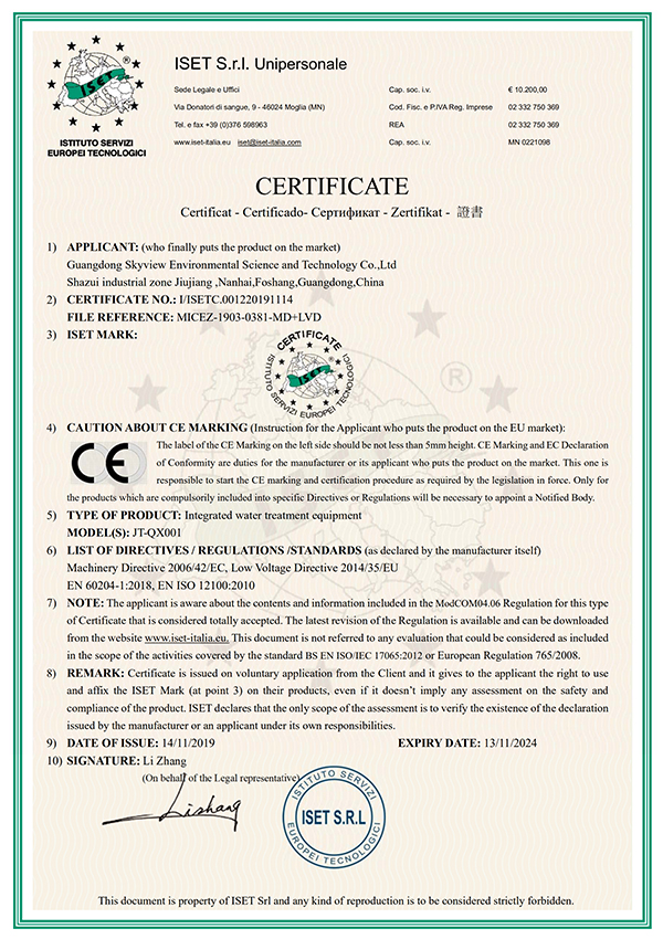Skyview es una compañía certificada en conformidad con el sistema de gestión de calidad ISO9001, el sistema de gestión ambiental ISO14001, la certificación del sistema de gestión de seguridad y salud ocupacional ISO45001 y contamos también con la certificación CE. También contamos con calificación de contratación de ingeniería para proyectos de ingeniería municipal y ambiental, operación y mantenimiento de instalaciones de tratamiento de agua y licencia de producción de seguridad en la construcción.